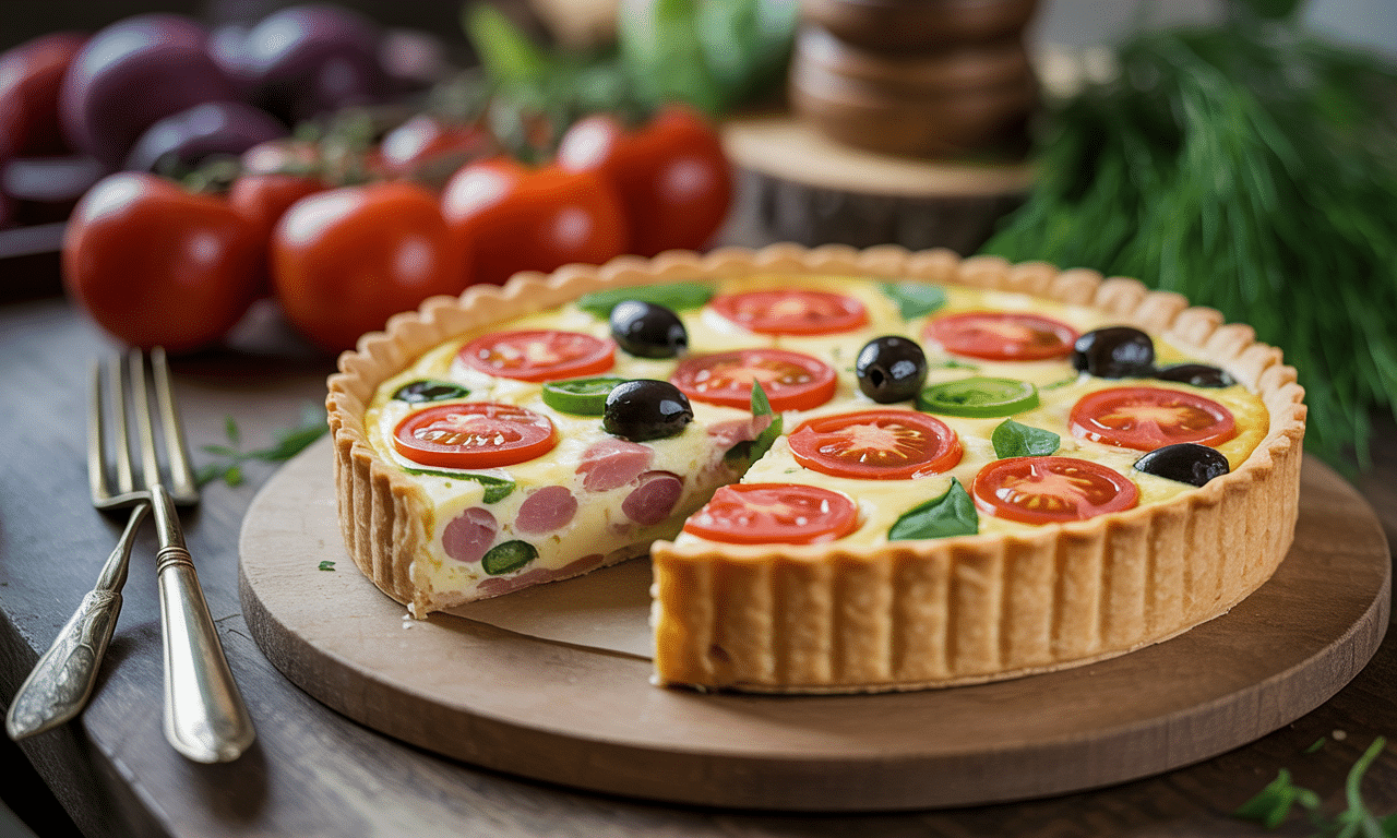 Je crois que ce qui fait tout le charme de cette Quiche Authentique, c’est le mariage du jambon doux à l’étouffée et du fromage qui fond bien, alliés aux touches méditerranéennes du basilic, des tomates et des olives. Ça donne un plat qui raconte une histoire à la fois simple et gourmande, presque comme une balade dans le sud, un vrai Délice Méditerranéen.