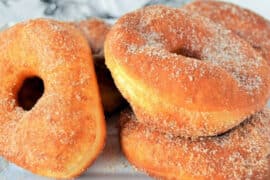 Frittieren Sie sie in gut heißem Öl und lassen Sie sie dann auf einem Kuchengitter abtropfen. Rollen Sie die Donuts noch heiß in Zimt-Zucker, um eine aromatische und knusprige Schicht zu erhalten.