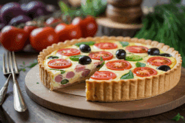 Creo que lo que hace todo el encanto de esta Quiche Auténtica es la combinación del jamón tierno a la étouffée y el queso que se funde bien, junto con los toques mediterráneos de la albahaca, los tomates y las aceitunas. Da un plato que cuenta una historia a la vez simple y gourmet, casi como un paseo por el sur, un verdadero Delicia Mediterránea.